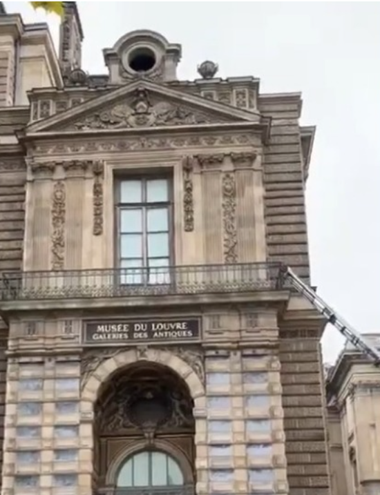 Deux d’entre eux – dont l’un portait un gilet fluorescent jaune – se sont servis de la plate-forme élévatrice pour atteindre le balcon donnant sur la Galerie d’Apollon, où sont exposés les bijoux de la Couronne de France.