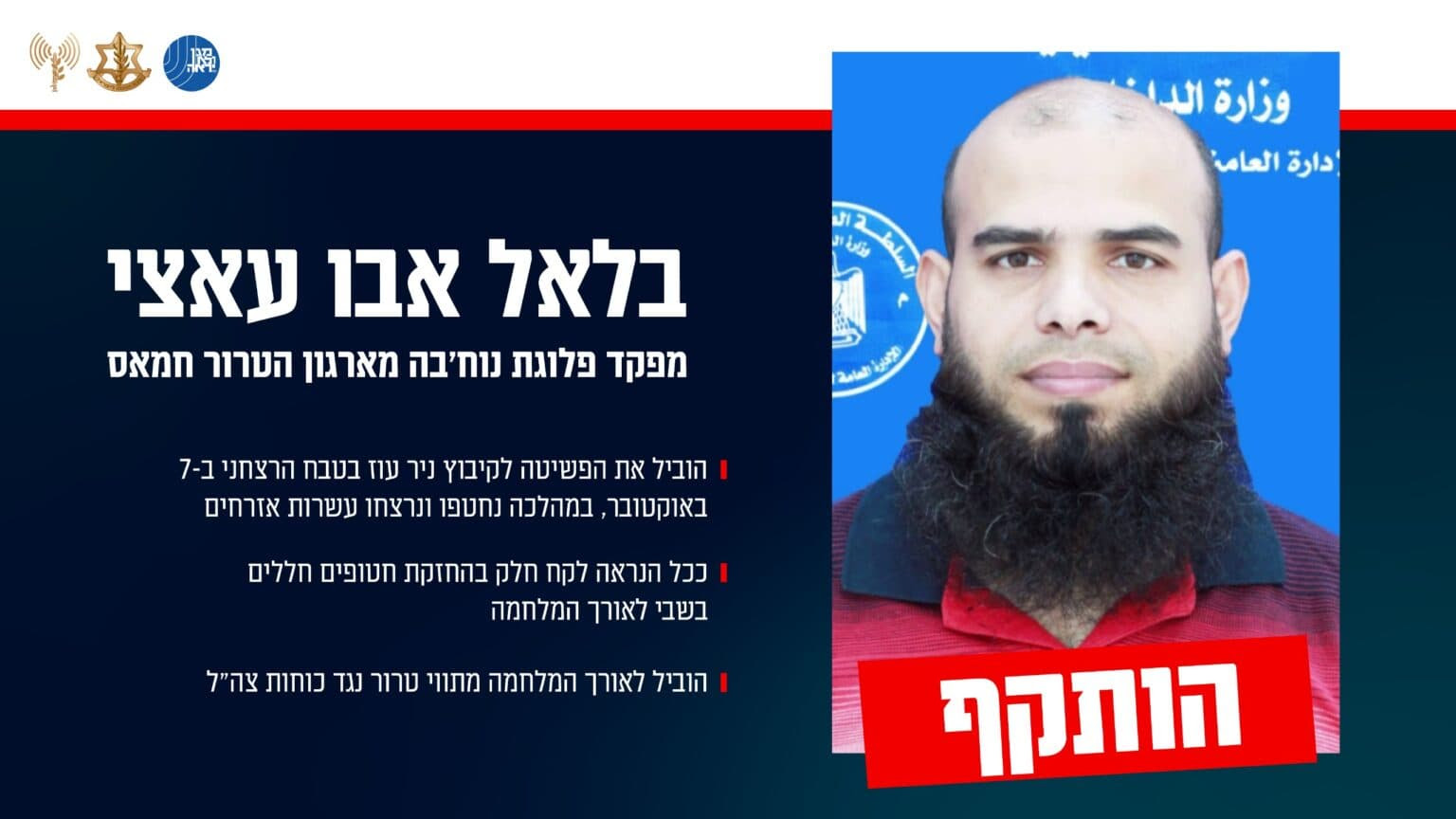 Selon les renseignements de Tsahal, Bilal Abu Atzi a joué un rôle central dans le massacre du 7 octobre, dirigeant le raid meurtrier contre le kibboutz Nir Oz au cours duquel des dizaines de civils israéliens ont été tués et enlevés. L’armée affirme qu’il a également participé activement à la rétention des corps d’otages tout au long du conflit et a continué de fomenter des attentats contre les forces israéliennes.