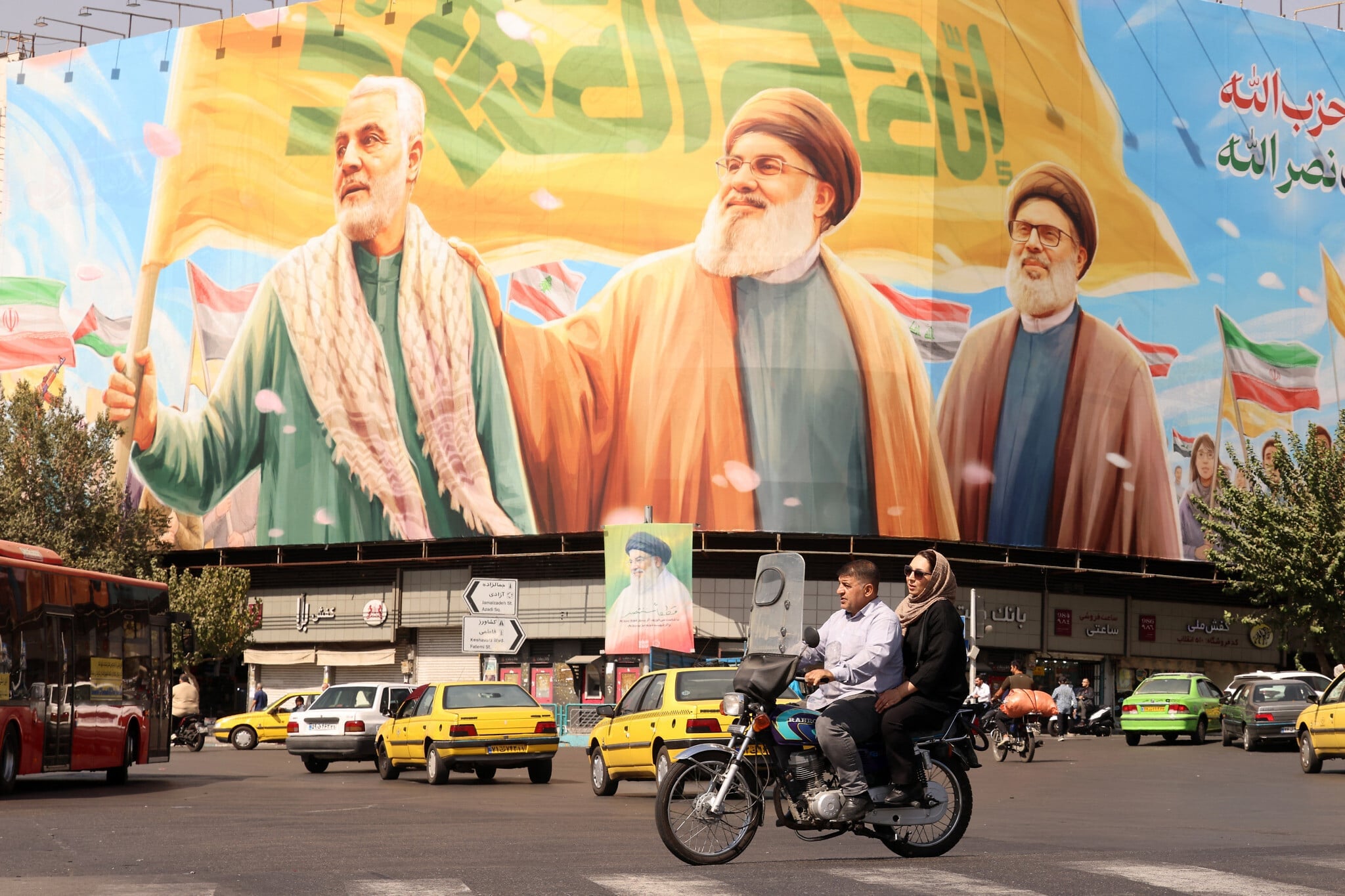 Des Iraniens roulant à moto devant un panneau d’affichage représentant les dirigeants libanais du groupe terroriste chiite libanais du Hezbollah éliminéz, Hassan Nasrallah (au centre) et son successeur Hashem Safieddine (à droite), ainsi que le général iranien Qasem Soleimani, à Téhéran, le 28 septembre 2025. (Crédit : Atta Kenare/AFP)